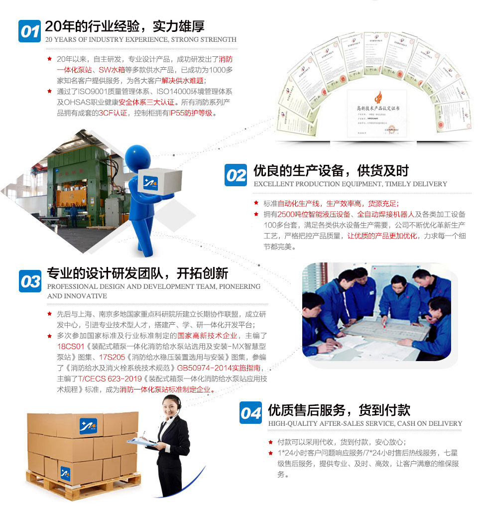 我公司以產品為導向與國家重點科研院所建立長期協作聯盟,成立了研發中心并先后開發了幾十個專利項目,抗浮箱泵一體化成套設備等多個產品被列為江蘇省高新技術產品。主編的...
